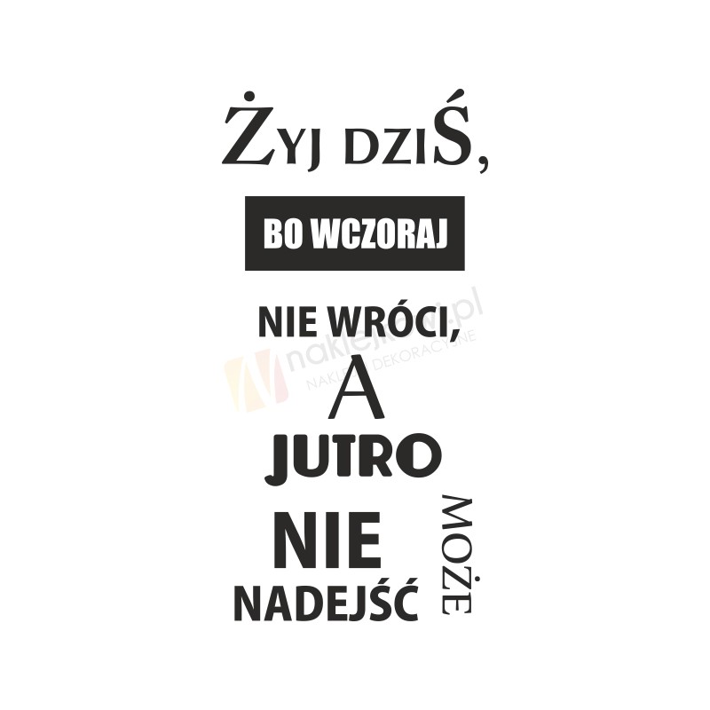 Naklejka dekoracyjna "Żyj dziś, bo wczoraj nie wróci, a jutro może nie nadejść" to sposób na kreatywną zmianę wystroju wnętrza salonu, przedpokoju, sypialni, pokoju dziennego czy pokoju młodzieżowego.