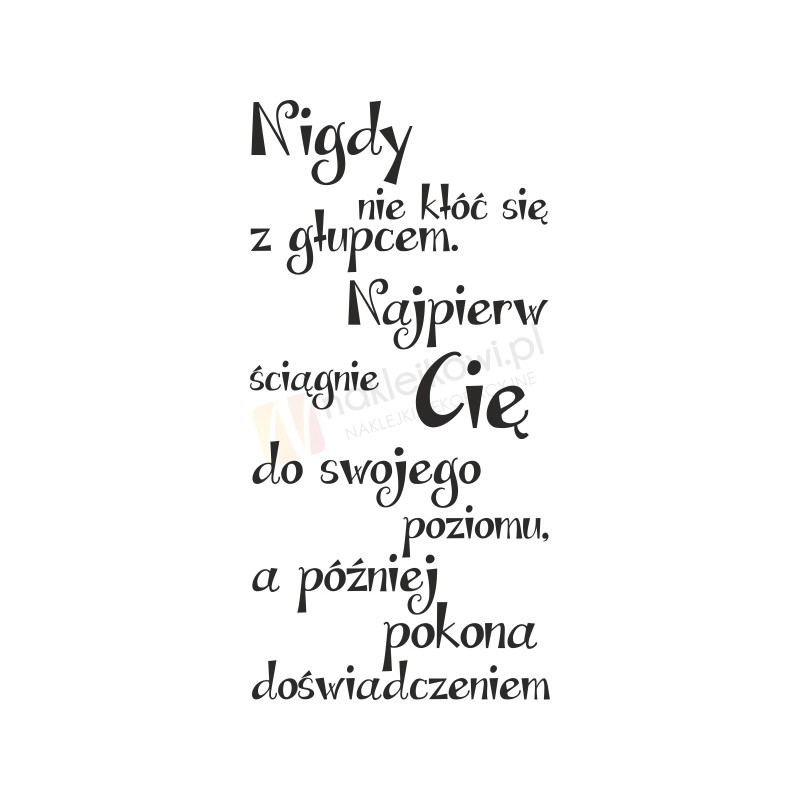 Naklejka humorystyczna "Nigdy nie kłóć się z głupcem. Najpierw ściągnie Cię do swojego poziomu, a później pokona doświadczeniem" to sposób na kreatywną zmianę wystroju wnętrza salonu, pokoju dziennego, przedpokoju czy pokoju młodzieżowego.
