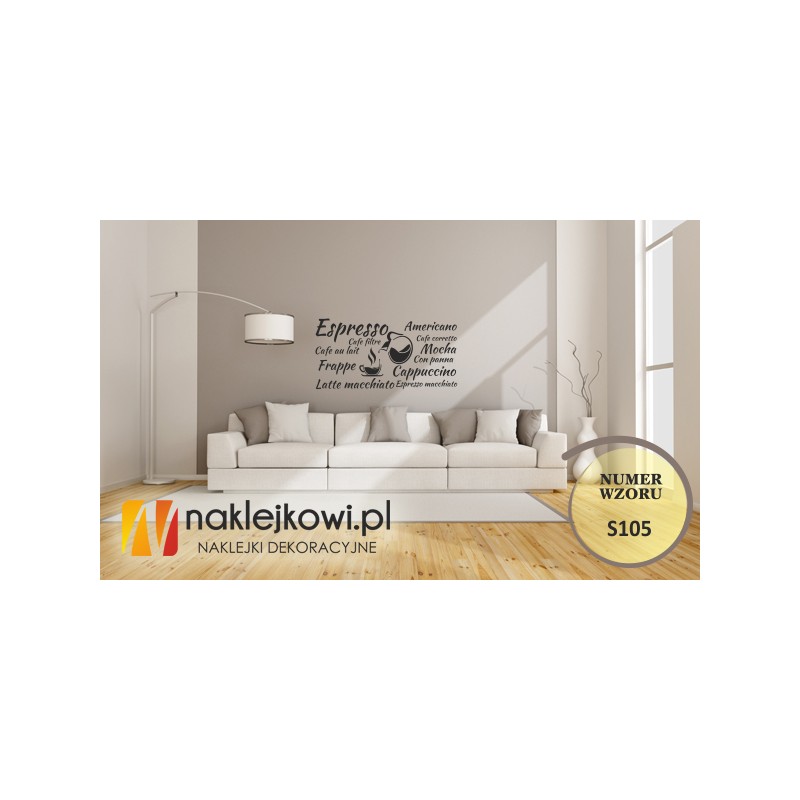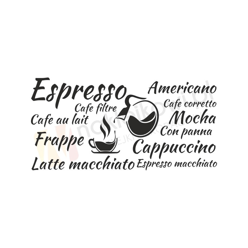 Naklejka "Espresso, Cafe filtre, Cafe au lait, Frappe, Latte macchiato, Americano, Cafe correto, Mocha, Con panna, Cappucciono, Espresso macchiato" to sposób na kreatywną zmianę wystroju wnętrza salonu, pokoju dziennego, kuchni czy jadalni.