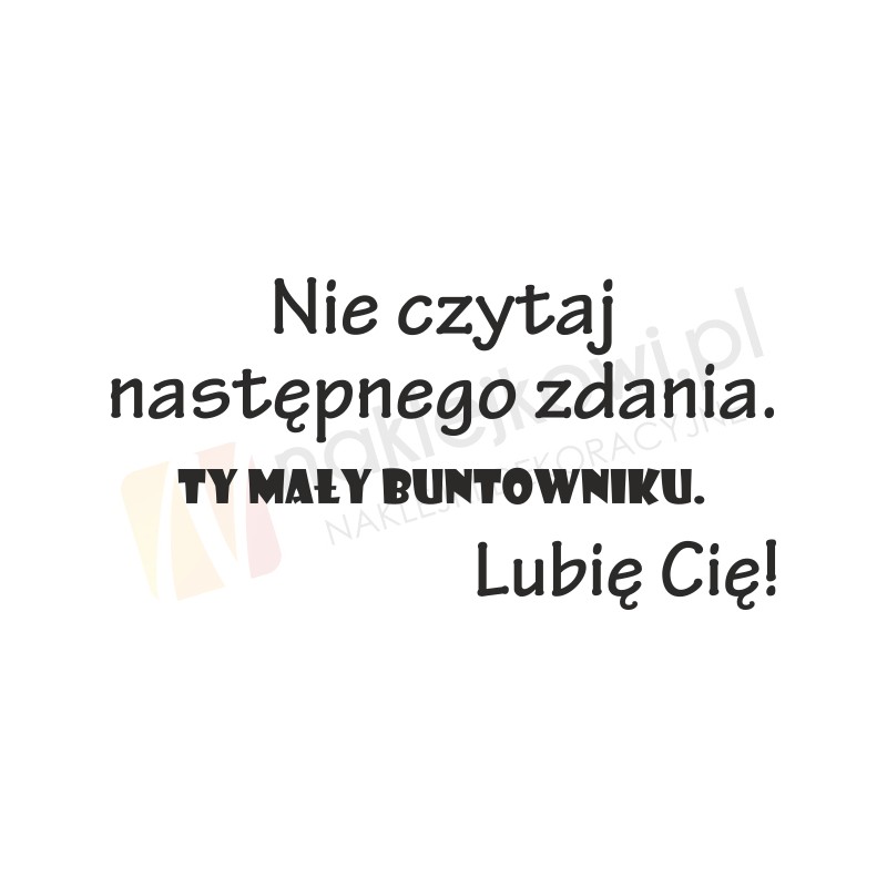 Naklejka humorystyczna "Nie czytaj następnego zdania. Ty mały buntowniku. Lubię Cię!" to sposób na kreatywną zmianę wystroju wnętrza salonu, przedpokoju, pokoju dziennego czy pokoju młodzieżowego.