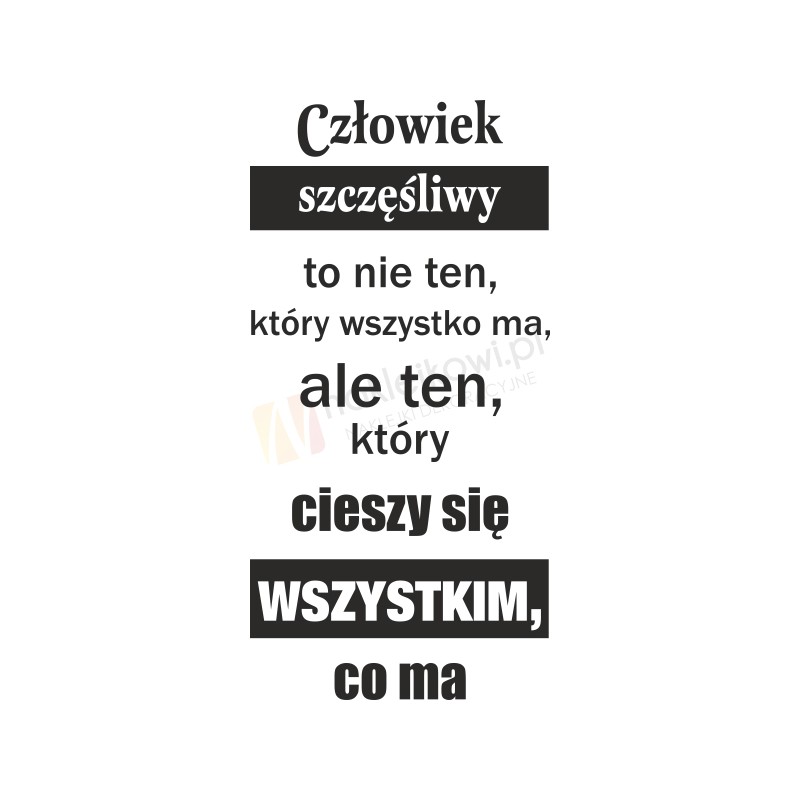 Naklejka "Człowiek szczęśliwy, to nie ten, który wszystko ma, ale ten, który cieszy się wszystkim, co ma" to sposób na kreatywną zmianę wystroju wnętrza salonu, pokoju dziennego czy pokoju młodzieżowego.