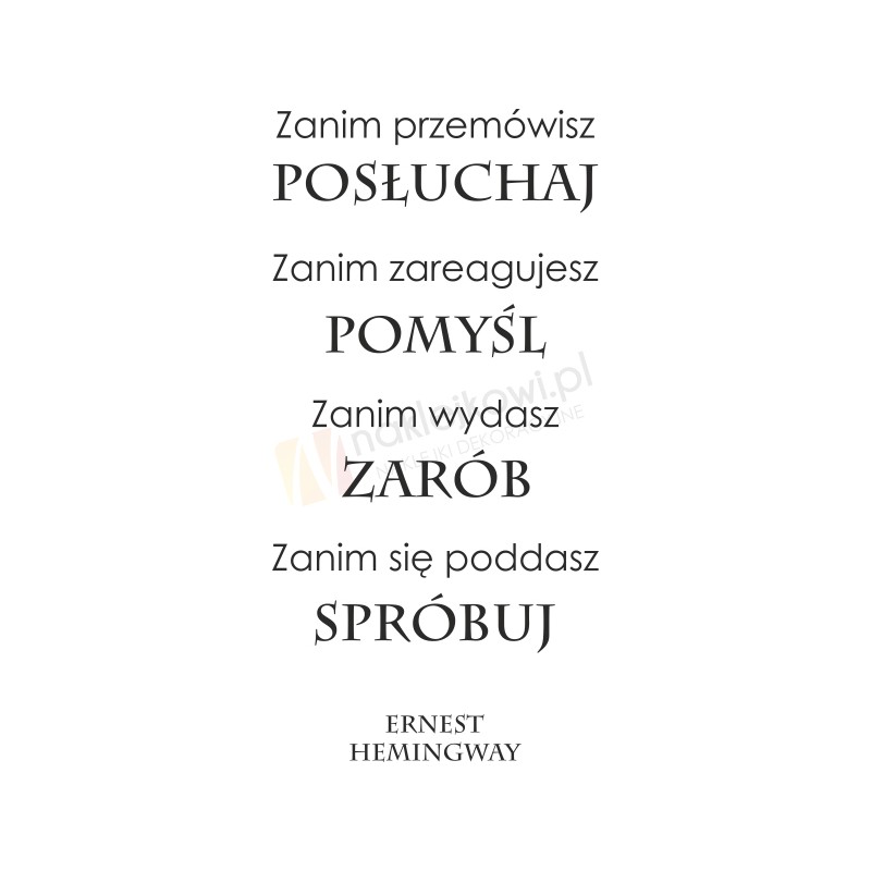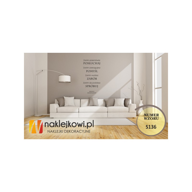 Naklejka "Zanim przemówisz – posłuchaj. Zanim zareagujesz – pomyśl. Zanim wydasz – zarób. Zanim się poddasz – spróbuj. Ernest Hemingway" to sposób na kreatywną zmianę wystroju wnętrza salonu, pokoju dziennego czy pokoju młodzieżowego.