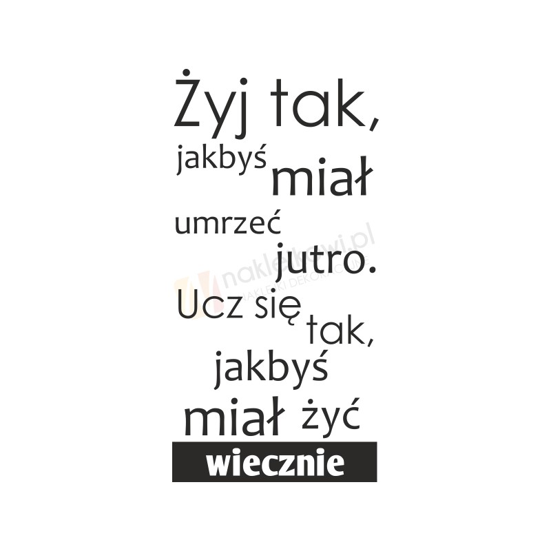 Naklejka motywująca "Żyj tak, jakbyś miał umrzeć jutro. Ucz się tak, jakbyś miał żyć wiecznie" to sposób na kreatywną zmianę wystroju wnętrza salonu, pokoju dziennego czy pokoju młodzieżowego.