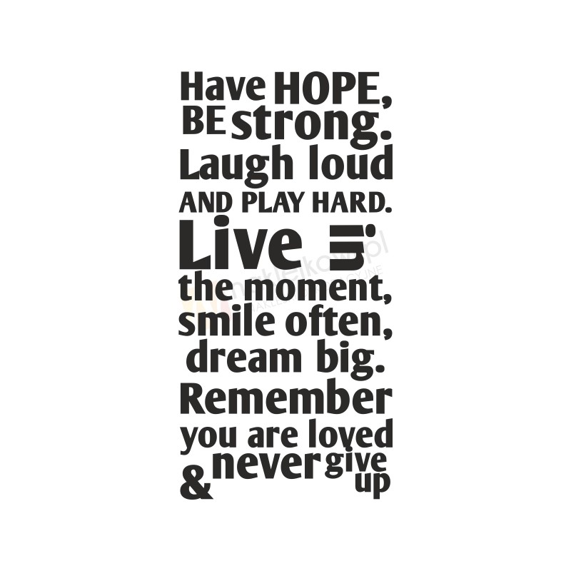 Naklejka "Have hope, be strong. Laugh loud and play hard.Live in the moment, smile often, dream big. Remember you are lovedand never never give up" to sposób na kreatywną zmianę wystroju wnętrza salonu, pokoju dziennego czy pokoju młodzieżowego.