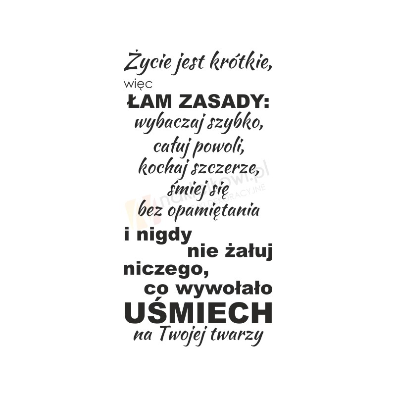 Naklejka "Życie jest krótkie, więc łam zasady: wybaczaj szybko, całuj powoli, kochaj szczerze, śmiej się bez opamiętania i nigdy nie żałuj niczego, co wywołało uśmiech na twojej twarzy." to sposób na kreatywną zmianę wystroju wnętrza przedpokoju, salonu, pokoju dziennego czy pokoju młodzieżowego.