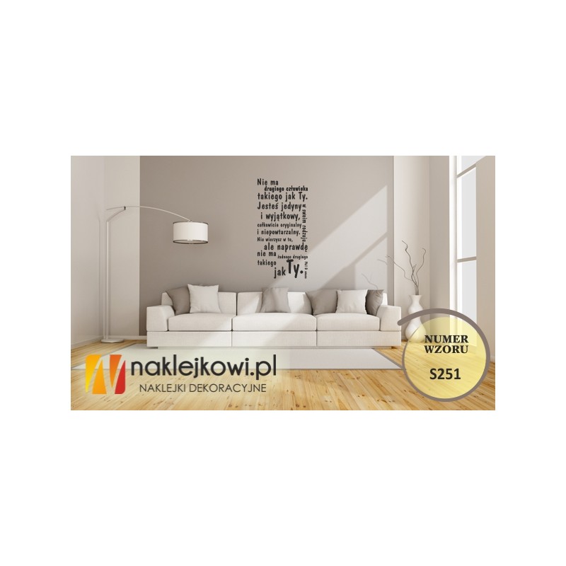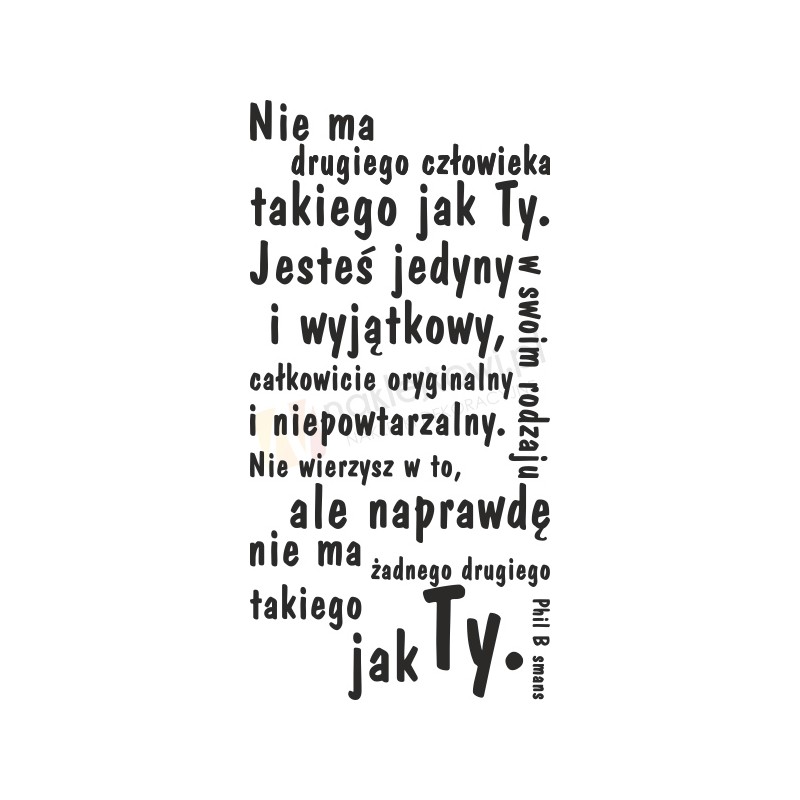 Naklejka na ścianę w formie cytatu "Nie ma drugiego człowieka takiego jak ty. Jesteś jedyny w swoim rodzaju i wyjątkowy, całkowicie oryginalny i niepowtarzalny. Nie wierzysz w to, ale naprawdę nie ma żadnego drugiego takiego jak ty. - Phil Bosmans "
