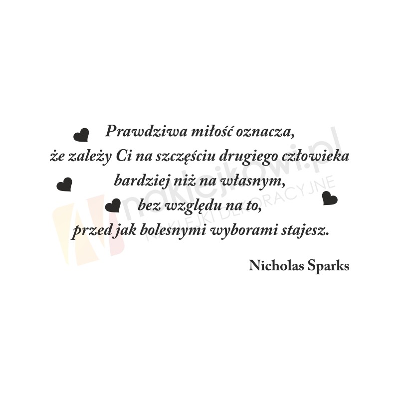 Naklejka na ścianę w formie cytatu "Prawdziwa miłość oznacza,że zależy ci na szczęściu drugiego człowieka bardziej niż na własnym, bez względu na to, przed jak bolesnymi wyborami stajesz. - Nicholas Sparks"