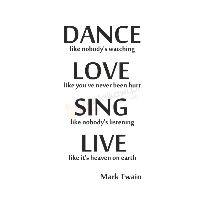Naklejka "Dance like nobody's watching, Love like you've never been hurt, Sing like nobody's listening, Live like it's heaven on earth. Mark Twain" to sposób na kreatywną zmianę wystroju wnętrza salonu, pokoju dziennego czy pokoju młodzieżowego.