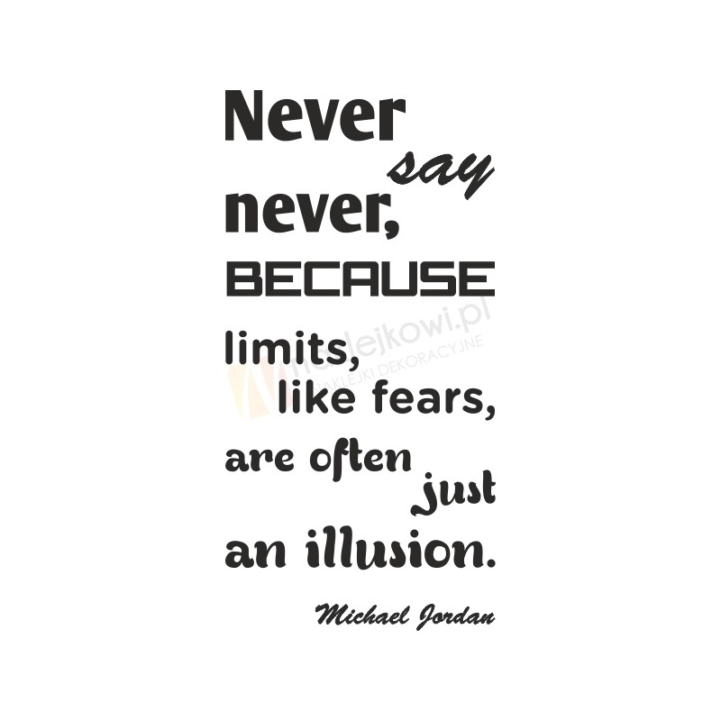Naklejka w formie cytatu-motywatora "Never say never, because limits, like fears, ale often just an illusion. Michael Jordan" to sposób na kreatywną zmianę wystroju wnętrza salonu, pokoju dziennego czy pokoju młodzieżowego.