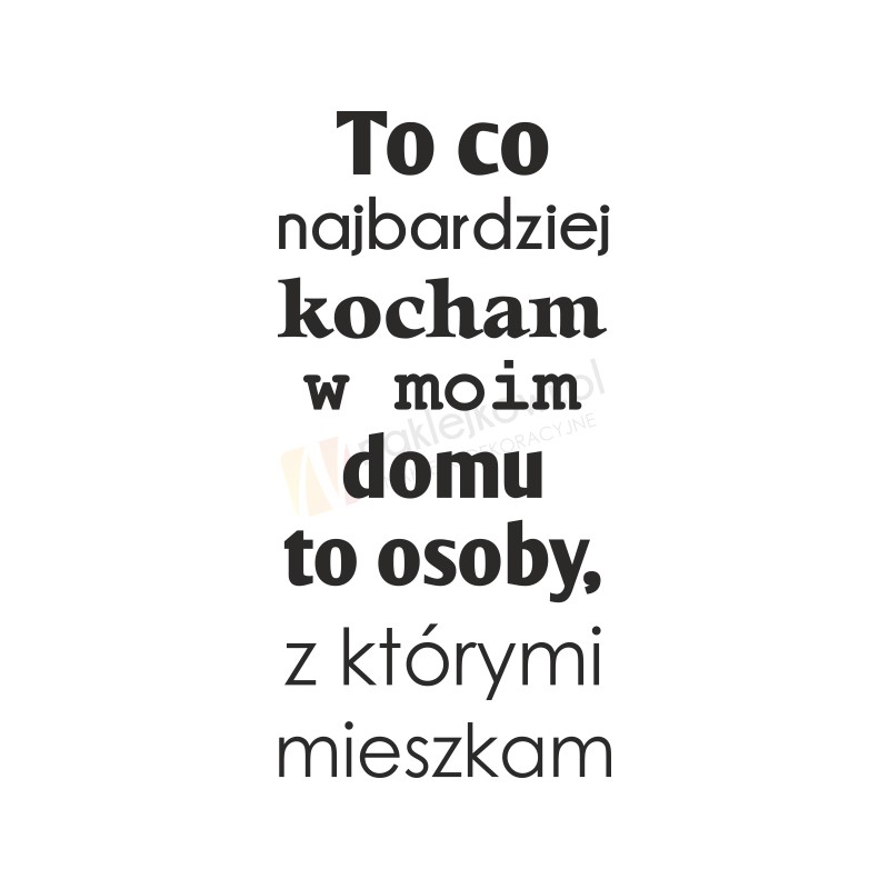 Naklejka dekoracyjna "To co najbardziej kocham w moim domu to osoby, z którymi mieszkam " to sposób na kreatywną zmianę wystroju wnętrza sypialni, przedpokoju, salonu, pokoju dziennego czy pokoju młodzieżowego.