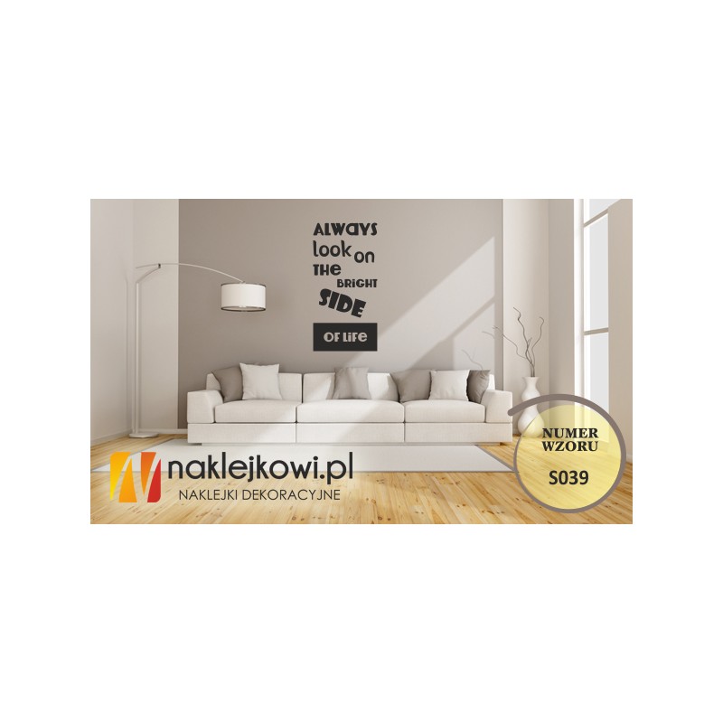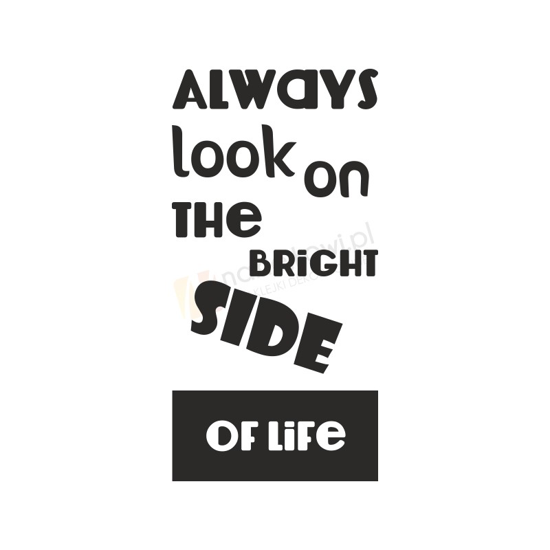 Naklejka dekoracyjna "Always look on the bright side of life" to sposób na kreatywną zmianę wystroju wnętrza salonu, pokoju dziennego czy pokoju młodzieżowego. Została stworzona o wszystkich tych, którzy chcą w niedrogi a efektywny sposób odświeżyć swoje wnętrze.