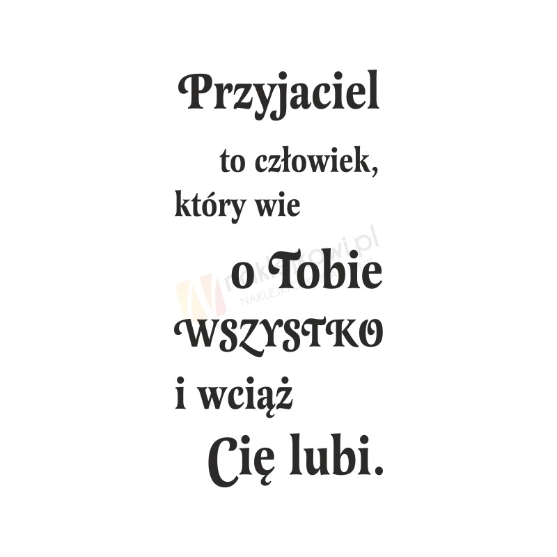 Naklejka dekoracyjna "Przyjaciel to człowiek, który wie o Tobie wszystko i wciąż Cię lubi." to sposób na kreatywną zmianę wystroju wnętrza salonu, pokoju dziennego czy pokoju młodzieżowego.