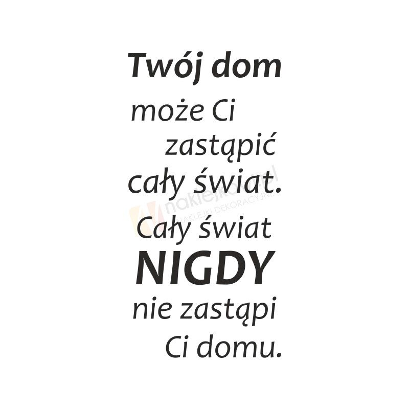 Naklejka dekoracyjna "Twój dom może Ci zastąpić cały świat. Cały świat nigdy nie zastąpi Ci domu." to sposób na kreatywną zmianę wystroju wnętrza salonu, sypialni, przedpokoju, pokoju dziennego czy pokoju młodzieżowego.