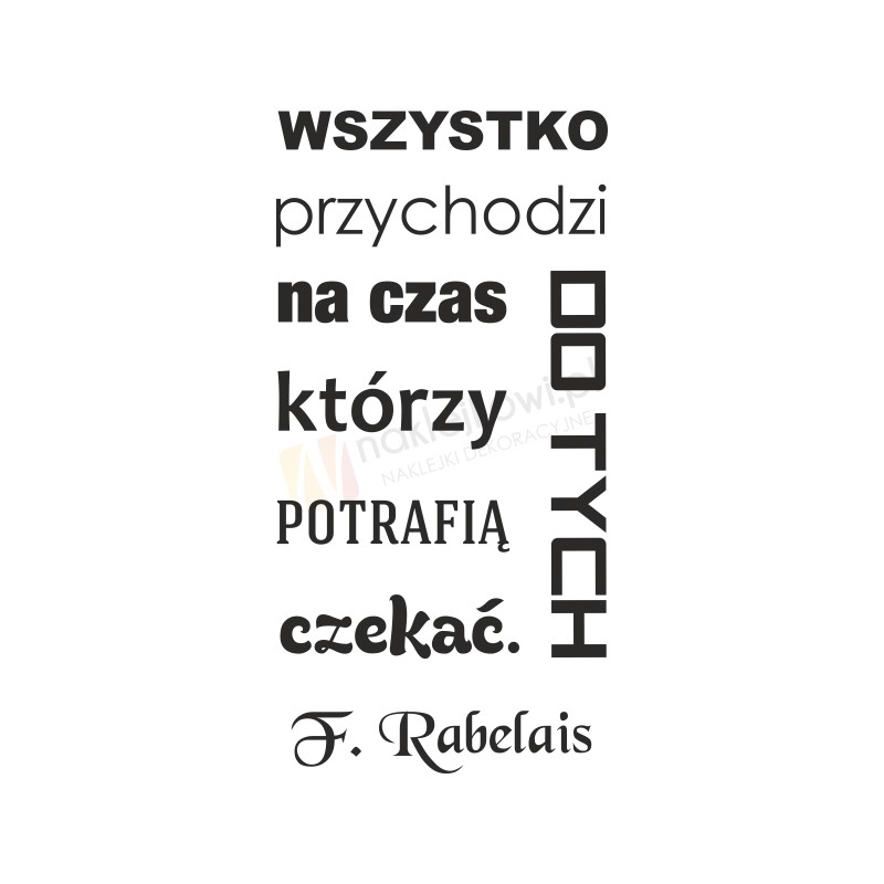 Naklejka "Wszystko przychodzi na czas do tych, którzy potrafią czekać. F. Rabelais" to sposób na kreatywną zmianę wystroju wnętrza salonu, pokoju dziennego czy pokoju młodzieżowego.